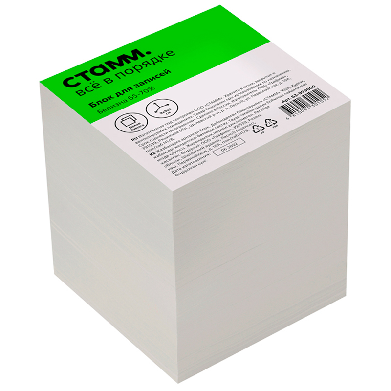 Блок для записей СТАММ белый 9х9х9 см, белизна 65-70%