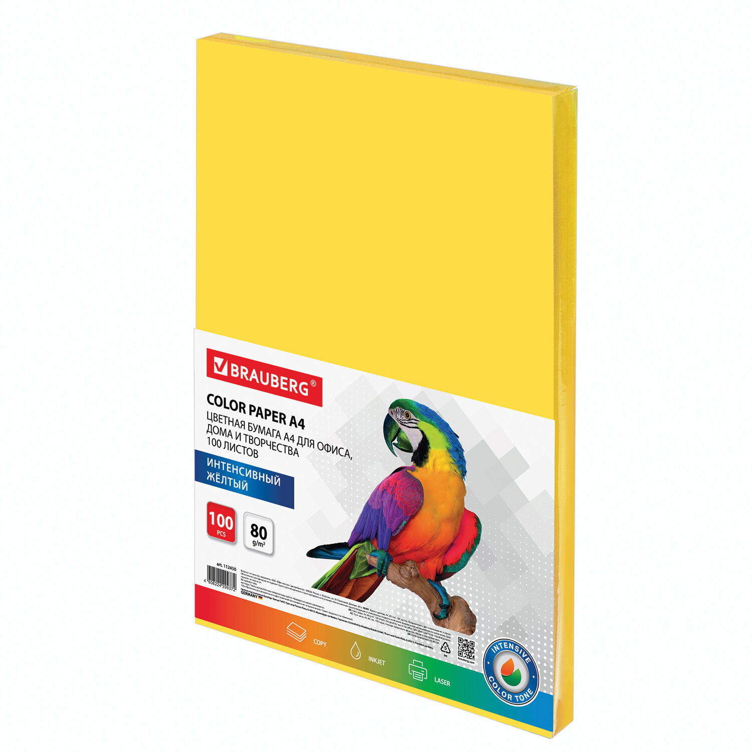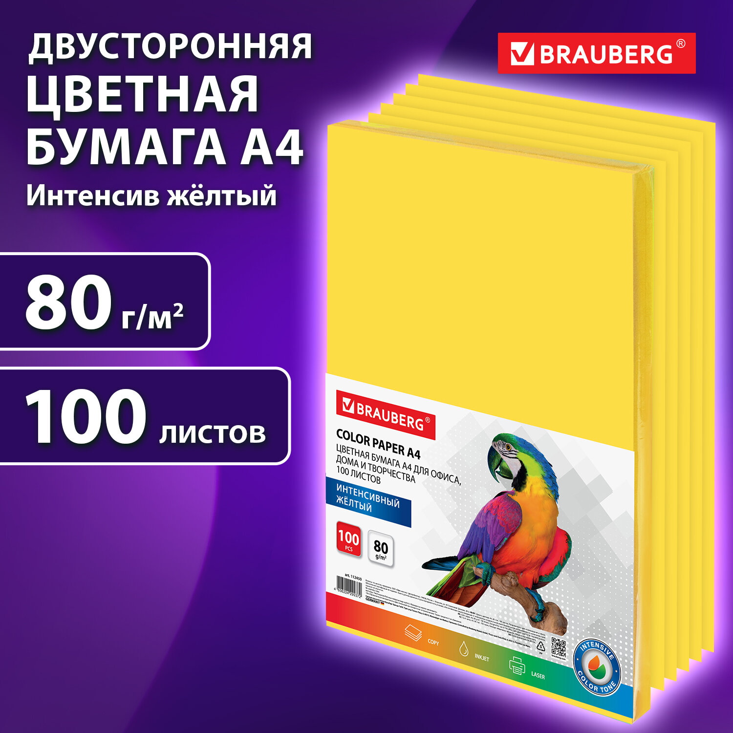 Бумага цветная BRAUBERG Intensive, А4, 80 г/кв.м., 100 л., желтая