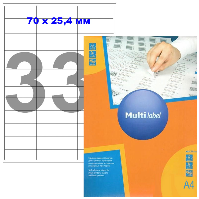 Этикетки самоклеящиеся Multilabel, А4, 70 х 25,4 мм., 33 шт/лист, 100 л.
