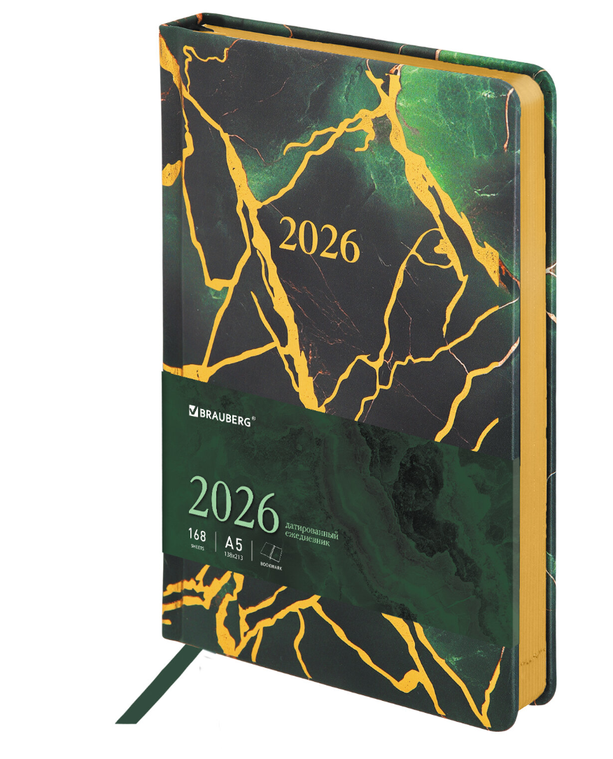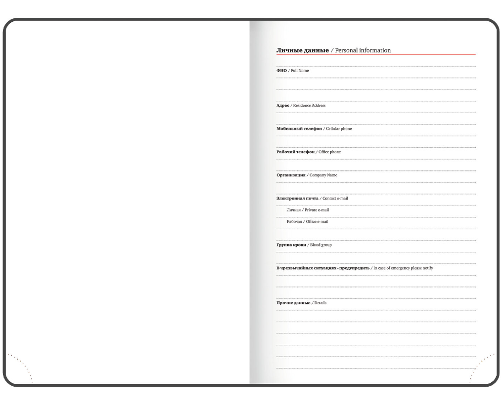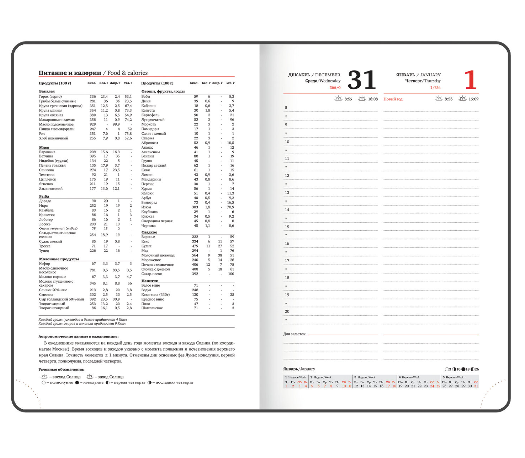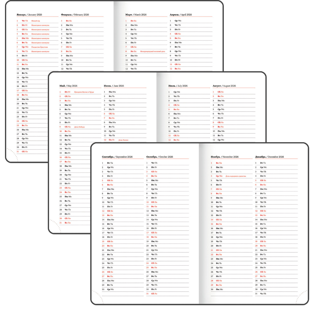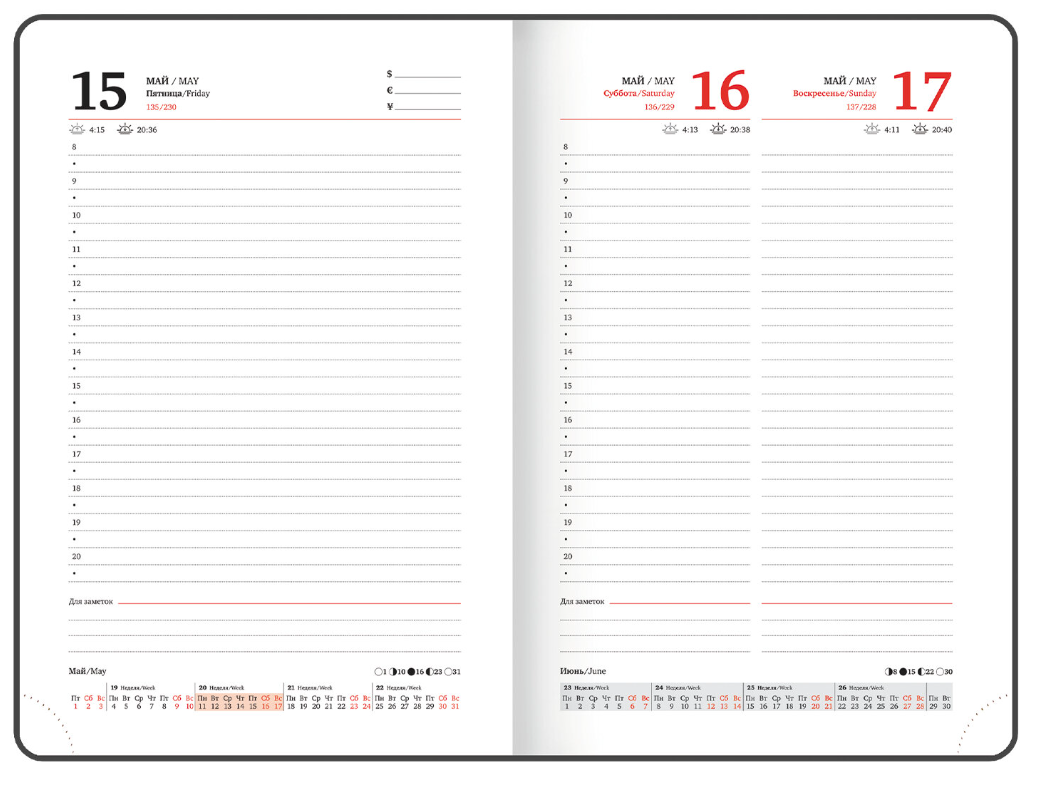 Внутренний блок включает 168 листов белой бумаги плотностью 70 г/м2. Каждая страничка имеет перфорированный угол. Благодаря стандартному формату А5 (138х213 мм) ежедневник удобно использовать как в офисе, так и на выездных деловых встречах.