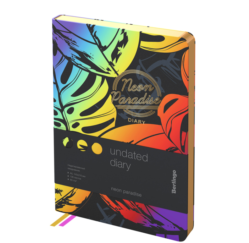 Недатированные ежедневники Berlingo "Neon Paradise" в мягкой обложке из искусственной кожи с ярким дизайном. Фольгированные элементы дизайна на обложке. Золотой срез блока. Внутренний блок из 136 листов высококачественной кремовой бумаги повышенной плотности 80 г/м², пантонная печать в 2 краски, справочный материал и перфорированные уголки. Две закладки-ляссе. Отрывные заметки, бланки извещения о ДТП и справочные материалы. 3 комплекта стикеров станут приятным подарком. Индивидуальная упаковка. Подходят под персонализацию