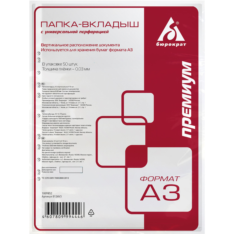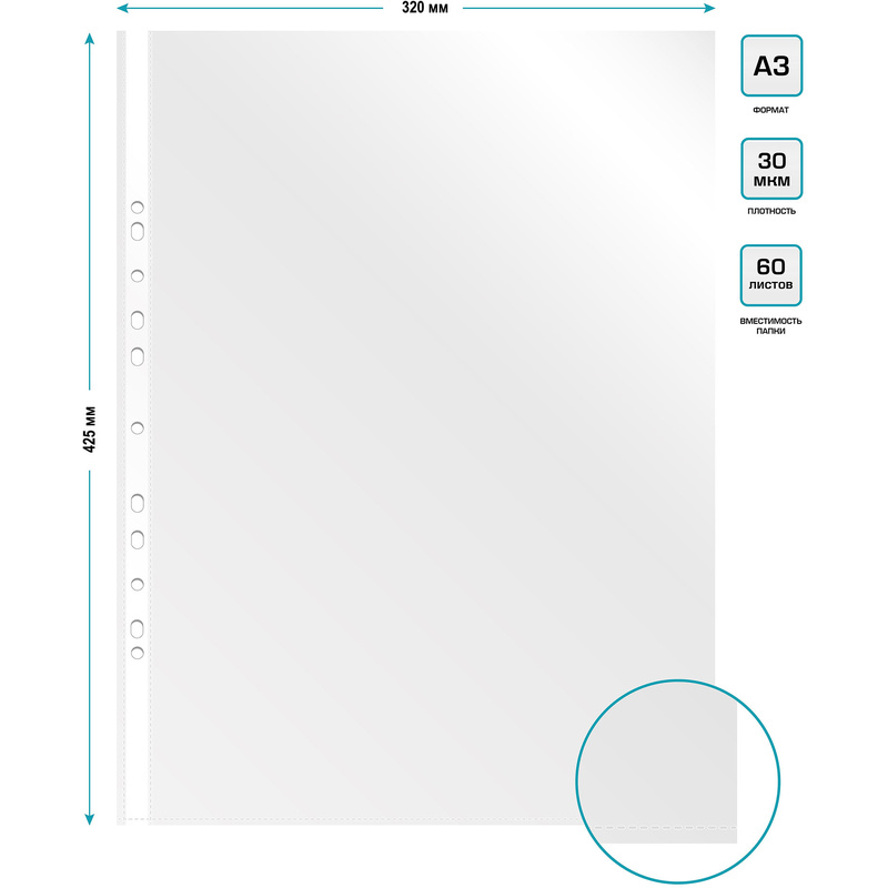 Файл-вкладыш Бюрократ Премиум, формат А3, 30 мкм, вертикальный, 50 штук в упаковке