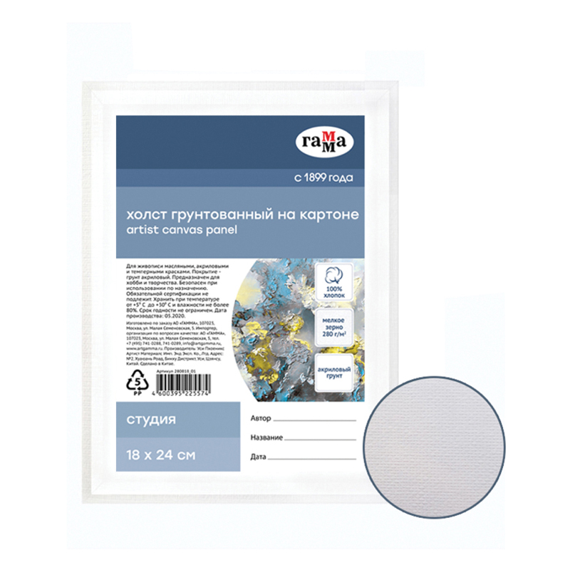 Холст на картоне Гамма "Студия", 18*24см, 100% хлопок, 280г/м2, мелкое зерно 280818_01