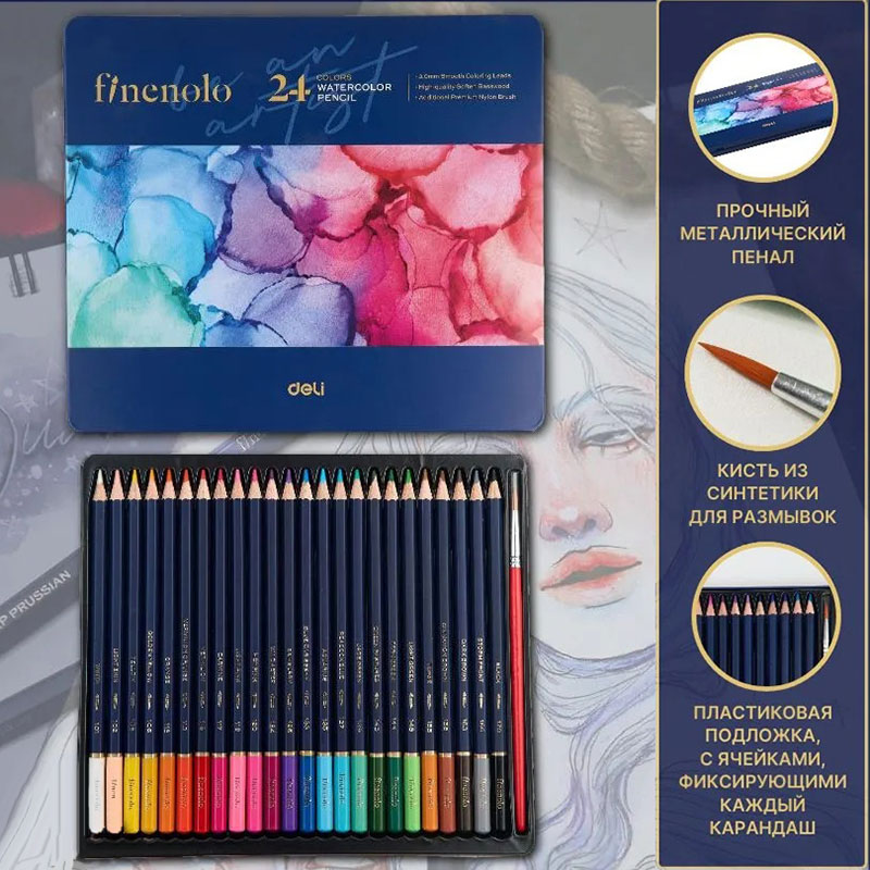 Карандаши акварельные Deli "Finenolo", 24 цвета, в метал. коробке