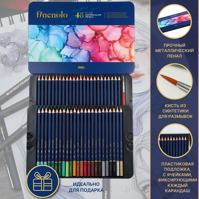Карандаши акварельные Deli "Finenolo", 48 цветов, в метал. коробке
