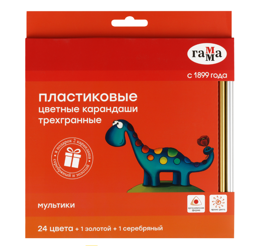 Карандаши цветные пластиковые Гамма "Мультики", 24цв.+1 золотой +1 серебряный, трехгранные, заточен, европодвес 19012324