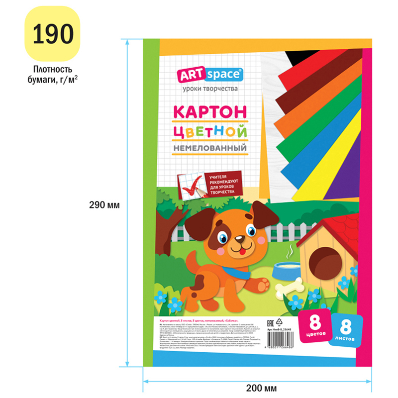 Картон цветной А4 ArtSpace "Собачка", немелованный, 8 листов, 8 цветов