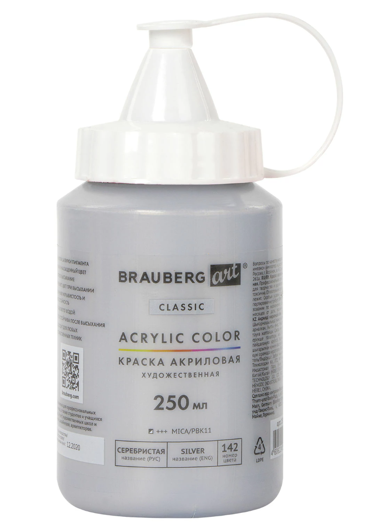 Краска акриловая художественная BRAUBERG ART CLASSIC, флакон 250 мл, СЕРЕБРИСТАЯ, 191715