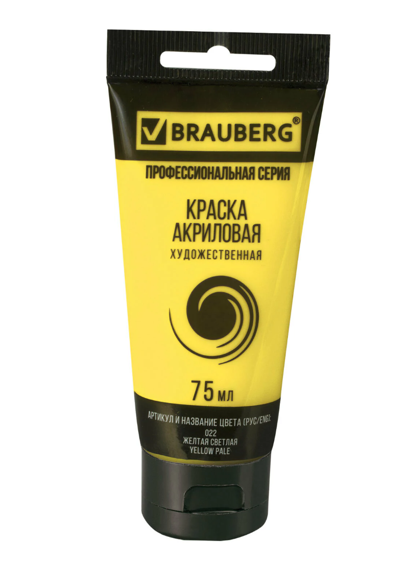 Краска акриловая художественная BRAUBERG туба 75мл, профессиональная серия, желтая светлая