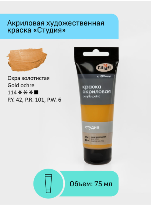 Краска акриловая художественная Гамма "Студия", 75мл, пластиковая туба, охра золотистая