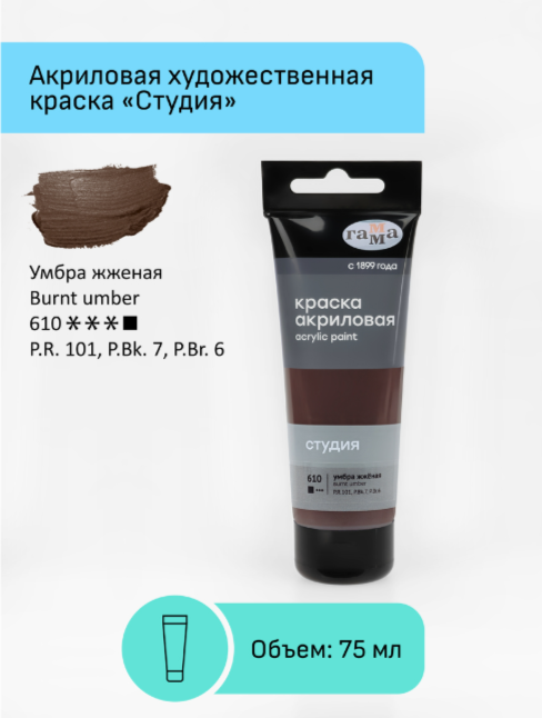 Краска акриловая художественная Гамма "Студия", 75мл, пластиковая туба, умбра жженая