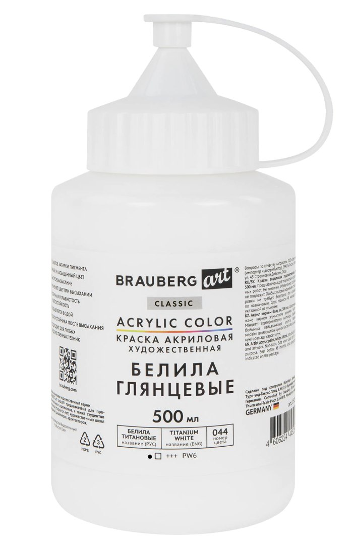 Краска акриловая художественная ГЛЯНЦЕВАЯ, 500 мл в банке, белила титановые, BRAUBERG ART, 192539