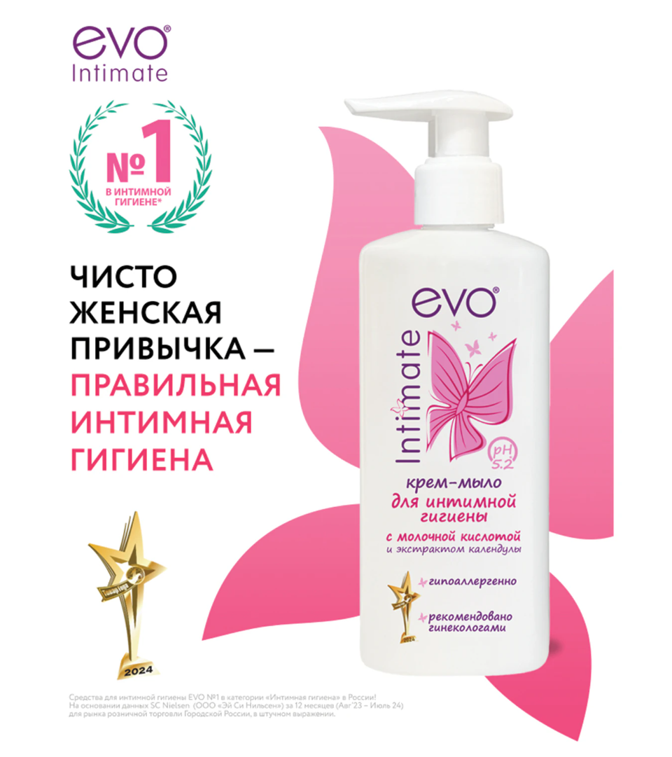 Крем-мыло для интимной гигиены гипоаллергенное с молочной кислотой 200мл EVO Intimate, дозатор,02781