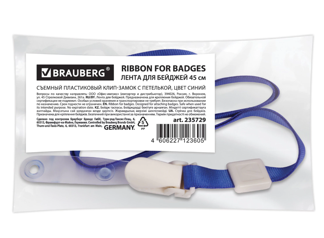 Лента для бейджей, 45 см, съемный пластиковый клип-замок с петелькой, СИНЯЯ, BRAUBERG, 235729