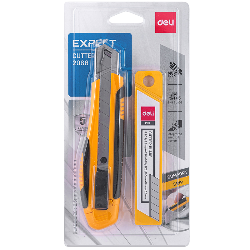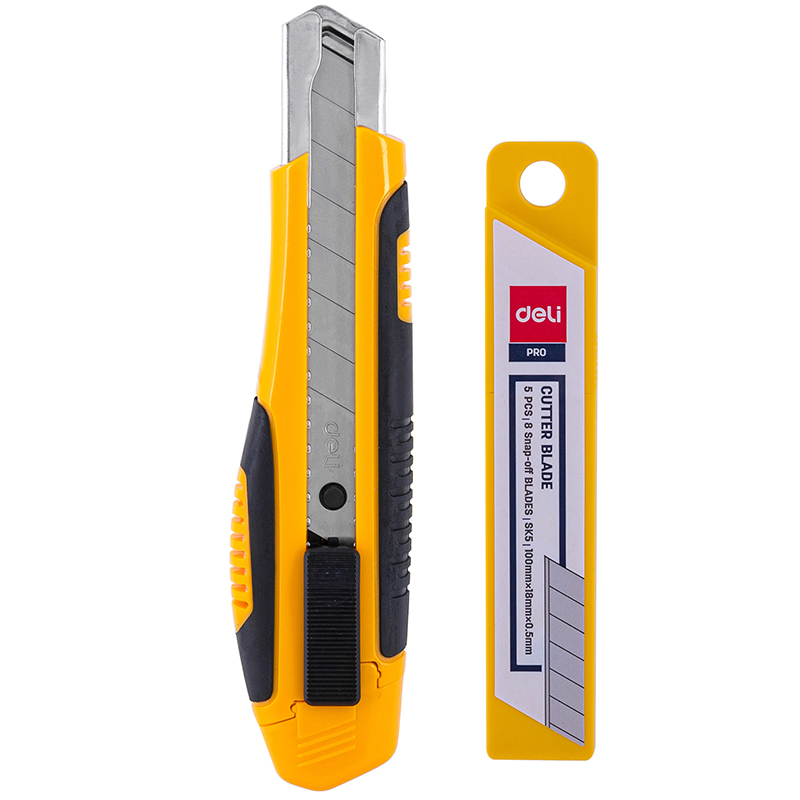 Набор DELI нож канцелярский 18 мм + лезвия, усиленный, прорезиненная ручка, блистер