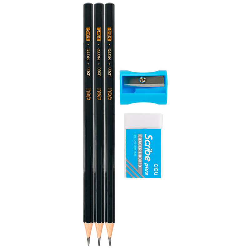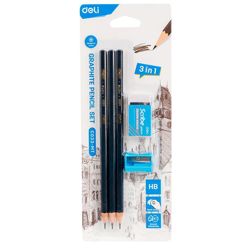 Набор карандашей чернографитных DELI, НВ, 3 штуки, точилка + ластик, блистер