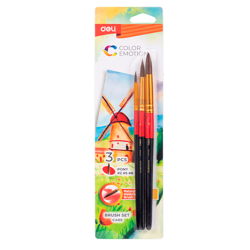 Набор кистей DELI "Color Emotion" для акварели и гуаши, 3 штуки в уп., Пони №2, 5, 8
