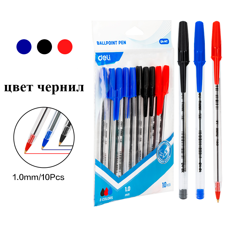 Набор шариковых ручек DELI "Think" Q4, 0,7 мм, 10 шт в еврподвесе, синяя, черная, красная