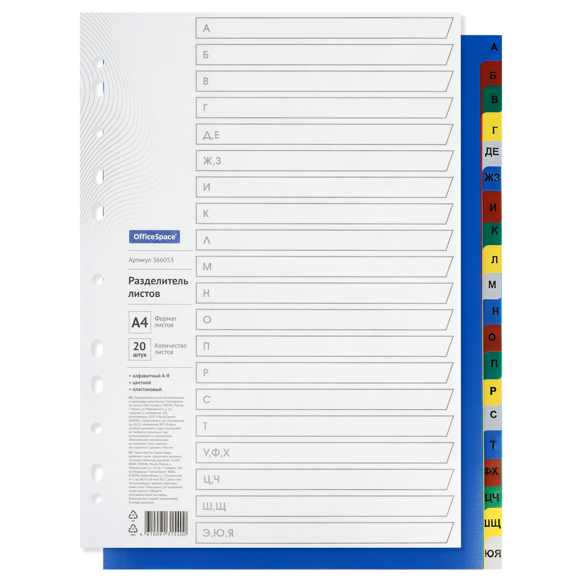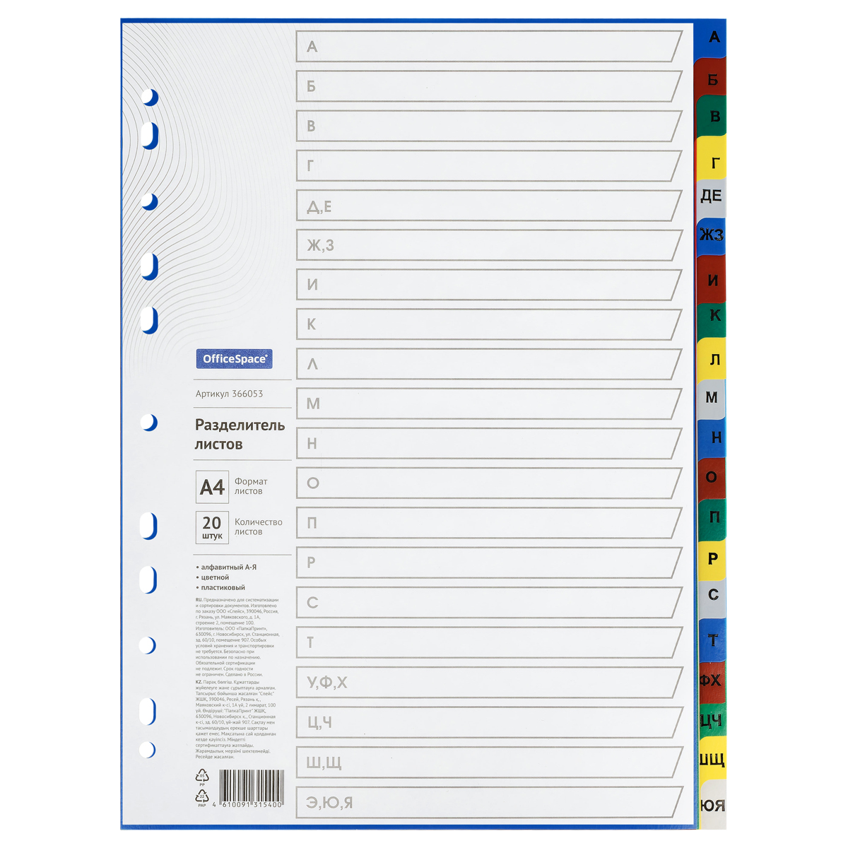 Разделитель пластиковый OfficeSpace, А-Я, А4, 20 листов, цветной