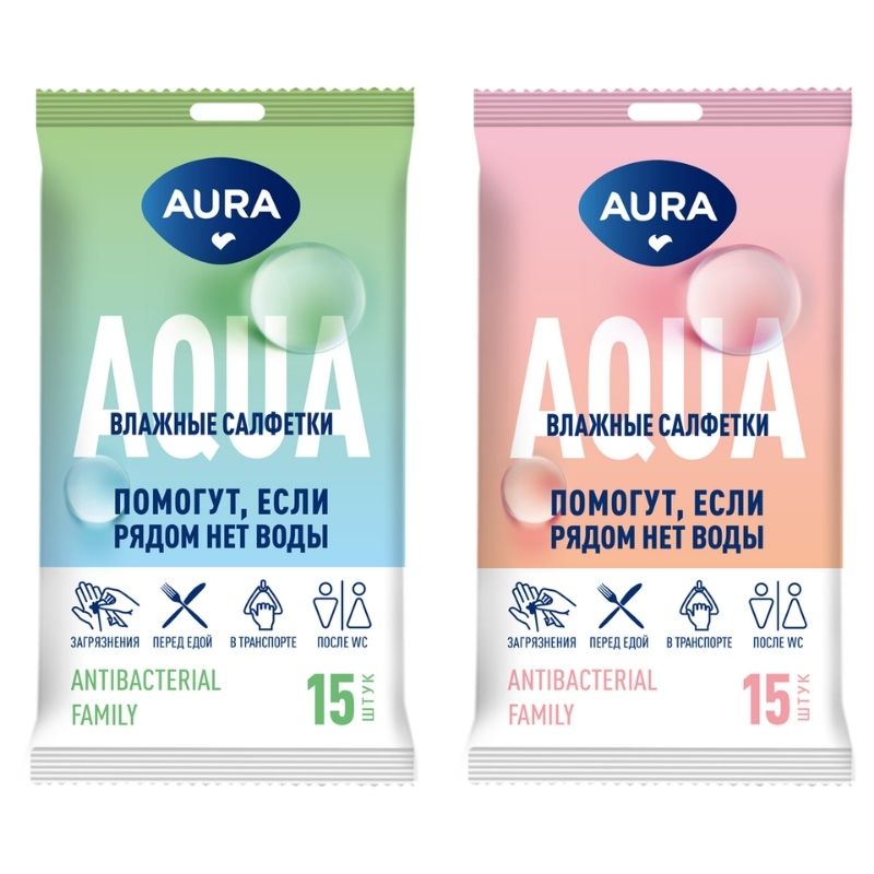 Салфетки влажные Aura "Family", антибактериальные, 15 штук в упаковке