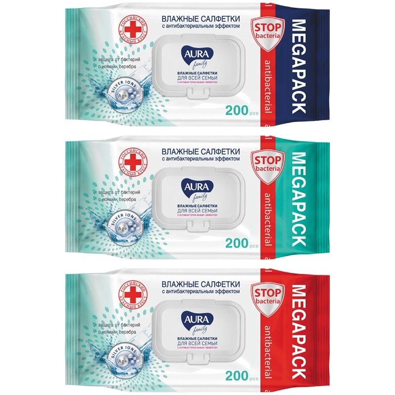 Салфетки влажные Aura "Family", антибактериальные, mega-pack с крышкой, 15*14см, 200 шт/упак