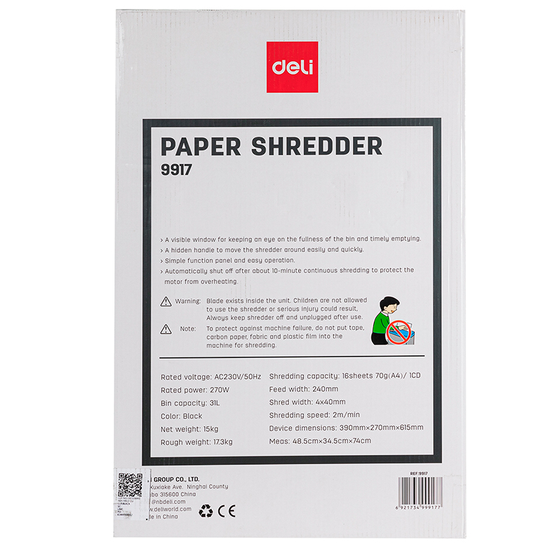 Шредер Deli, 4 уровень секретности (4х40мм), 16 листов, 31 литр