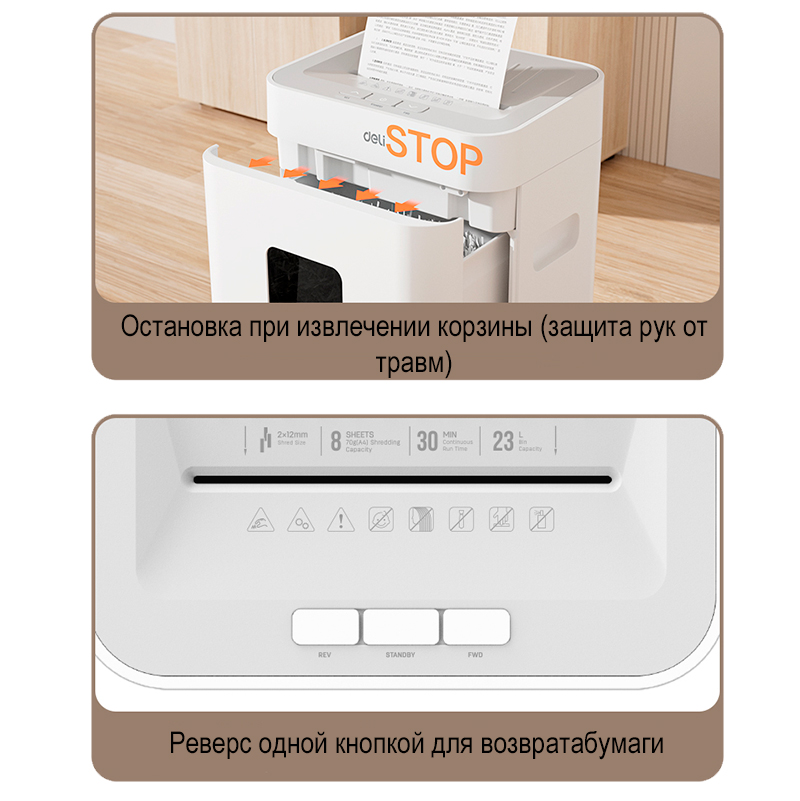 Шредер Deli, 5 уровень секретности (2х12мм), 8 листов, 23 литра