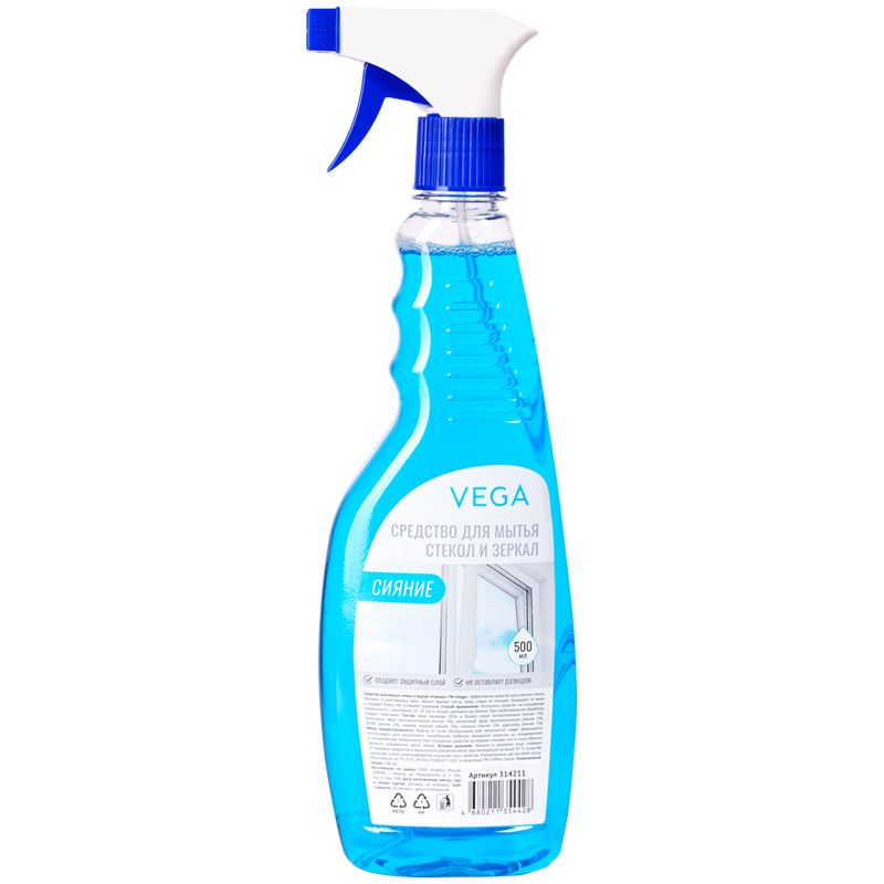 Средство для мытья стекол и зеркал Vega "Сияние", с распылителем, 500 мл