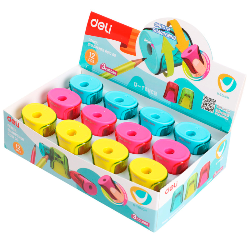 Точилка DELI "U-touch" пластиковая, 1 отверстие, с контейнером, ассорти