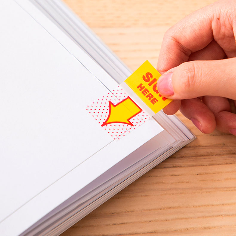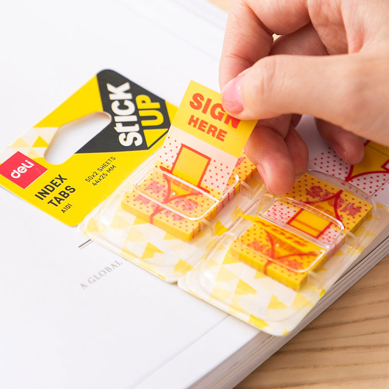 Закладки клейкие DELI "Подпишите здесь" 44 х 25 мм, 100 листов, диспенсер